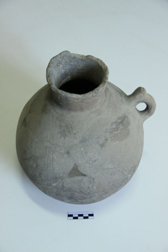 Сосуд сероглиняный с шаровидным туловом, высоким, слегка расширяющимся горлом и петлеобразной ручкой, по тулову орнамент из косых вертикальных полос, ниже и правее ручки - небольшое отверстие неясного назначения и происхождения. Размер:25 x 29 см. Ст. Воровсколесская. Источник: Ставропольский краевой краеведческий музей